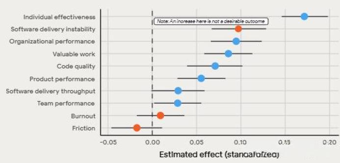 AI对个人、团队和组织的综合影响。整体表现正向,但也可能带来交付不稳定和额外摩擦