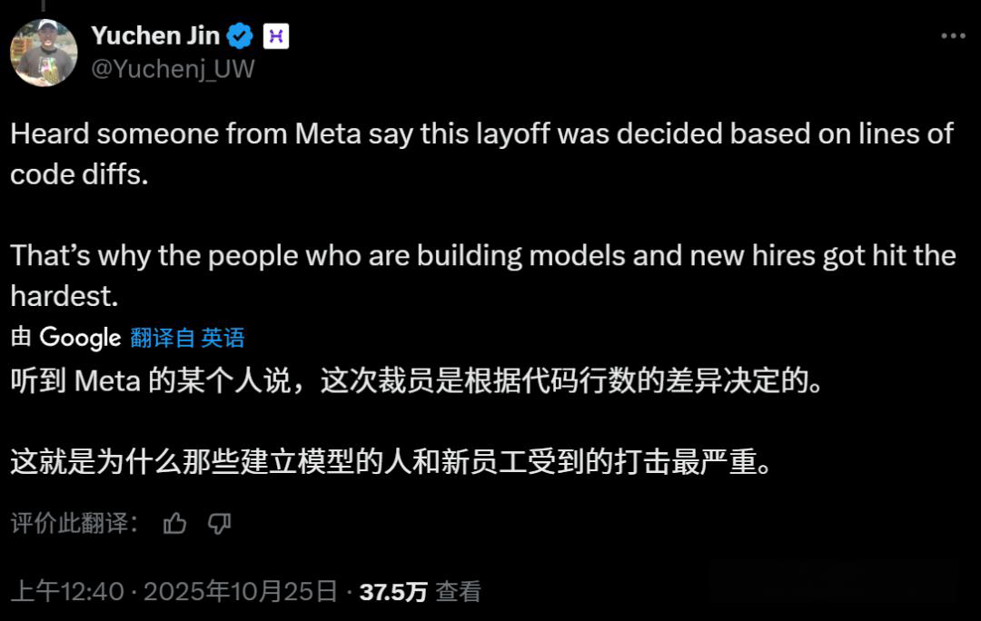 就在这两天Meta超级智能实验室大裁600人,有消息称公司简单粗暴到使用代码量决定裁员名单。