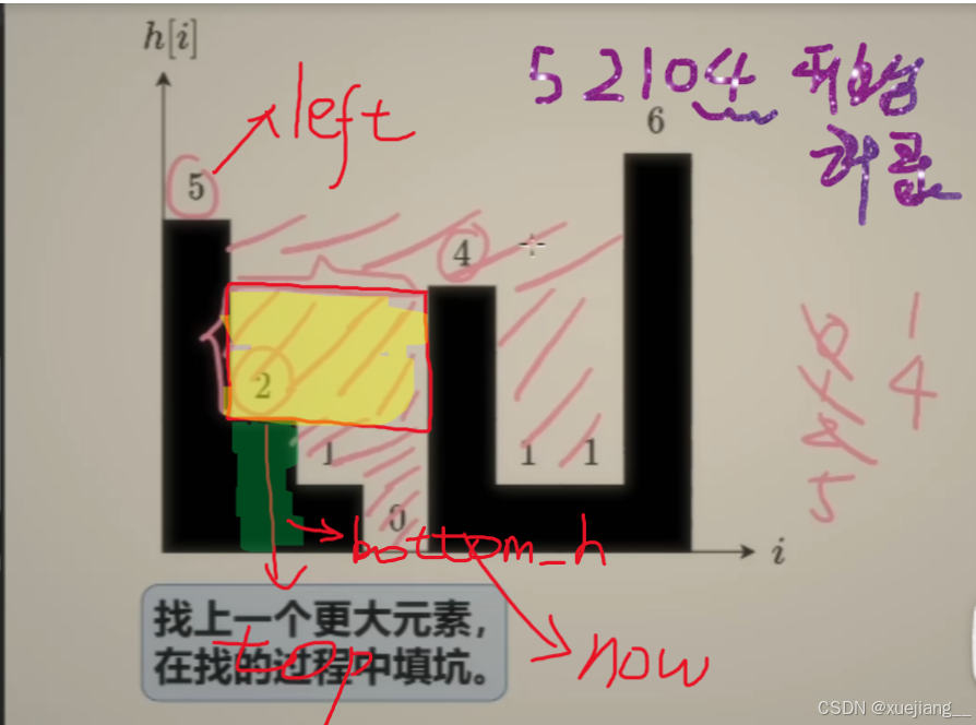 dh = min(height[left], h) - bottom_h # 面积的高 (举例取图中数字5和4最小的那位,再减去栈顶数值2)
