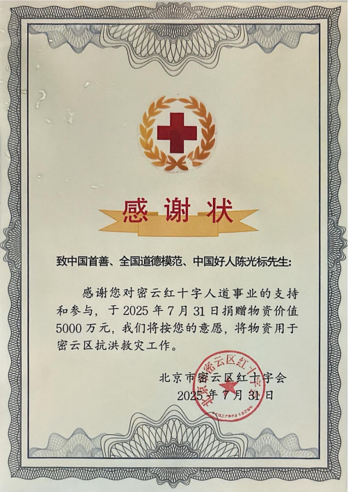 陈光标向北京密云灾区捐赠5000万元民生物资 多年累计慈善捐赠超50亿元