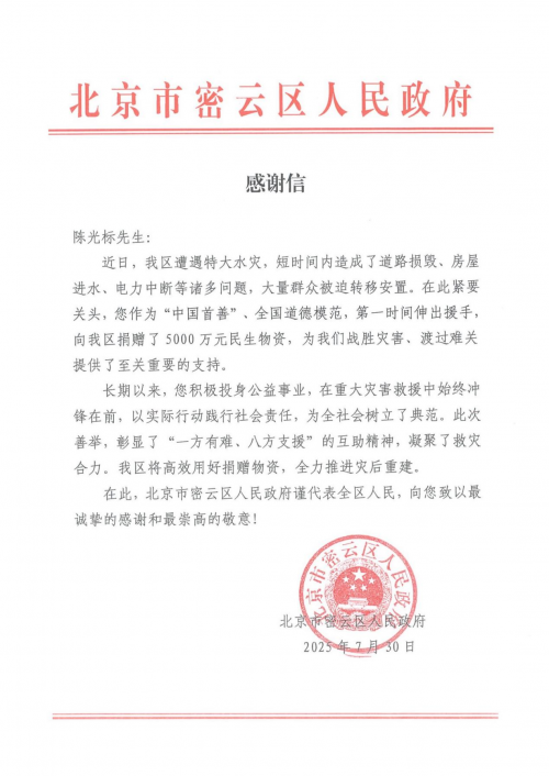 此次捐赠物资将定向用于灾区群众安置及灾后防疫等工作。密云区领导代表受灾群众表达了感谢:“灾害突发之际,陈光标先生率先响应、慷慨解囊,是中国企业家群体中首位捐助且规模最大的一位,这份情谊密云不会忘记。”