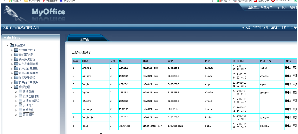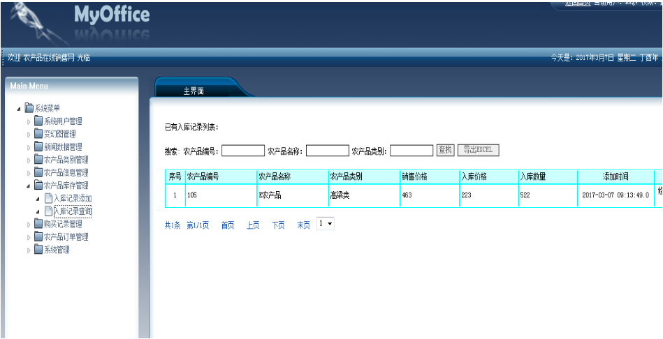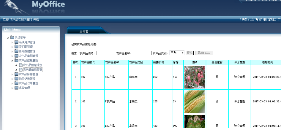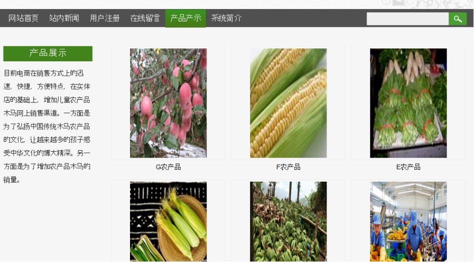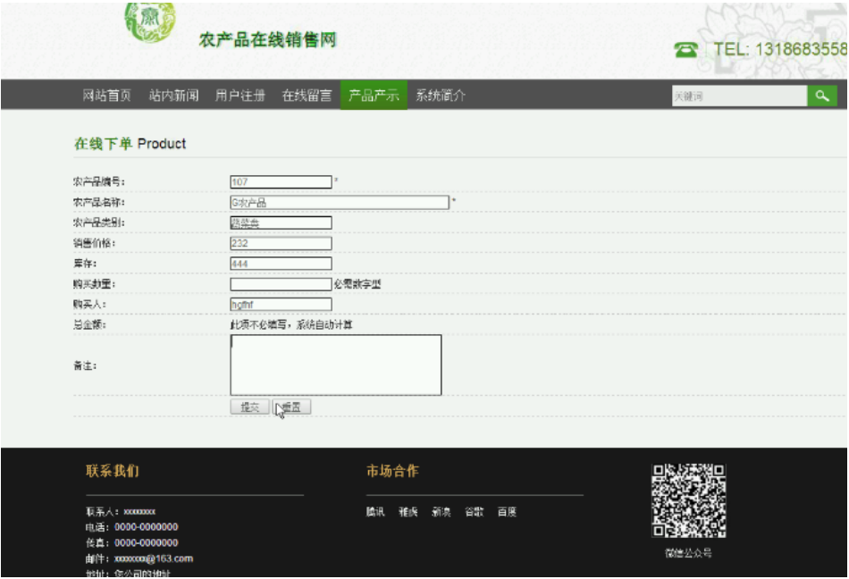 This website is to provide the main platform of a purchasing agricultural products and the management of agricultural products online sales network, through the price advantage to attract many consumers to buy, to achieve normal operation. This paper mainly USES the JAVA language, JSP technology, essentially a database as a development platform, tomcat server, system adopts B/S structure development, complete an online network of agricultural products. Goal is to achieve an online network centered on sales of agricultural products, build customer information and account number, account number, organic combination of agricultural management and order information business system.