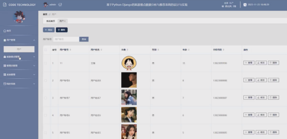 管理员点击用户管理;在用户管理页面输入用户名、性别、头像、联系电话等信息进行查询,添加或删除用户等操作;如图5-3所示。