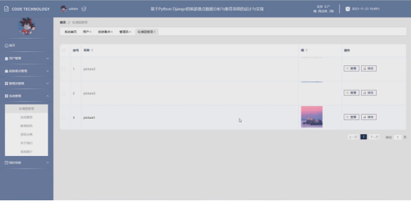 管理员点击轮播图管理;在轮播图管理页面输入名称、序号等信息,进行查询或删除轮播图等操作;如图5-6所示。