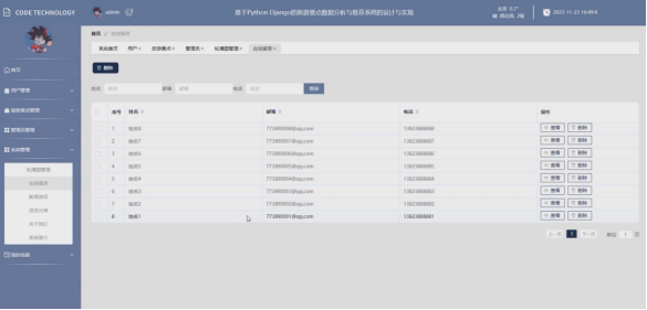 管理员点击在线留言管理;在在线留言管理页面输入姓名、邮箱、电话等信息,进行查询或删除留言信息等操作;如图5-7所示。