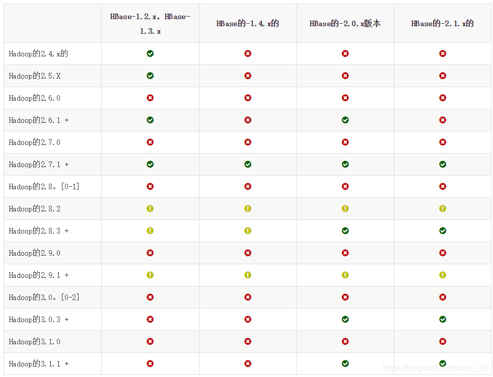 下表总结了每个HBase版本支持的Hadoop版本。未出现在此表中的较旧版本被视为不受支持且可能缺少必要的功能,而较新版本未经测试但可能适用。