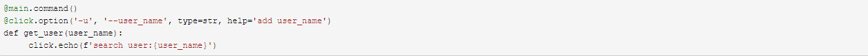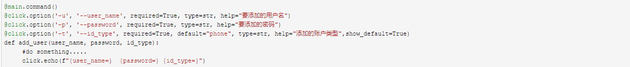 首先通过@main.command()将它加入到组。然后就是 option 一系列添加参数的操作。这个具体的参数信息上面都说了这里就不提了。好了我们就创建这两个成员,