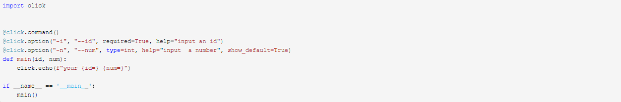 然后我们的函数main的参数名就是,我们要接收的参数的完整名称,同时通过click.echo打印出来。,f"{num=}" 是 Python 3.8 以后的语法糖,如果 num=3 那么它等价于 num = 3。