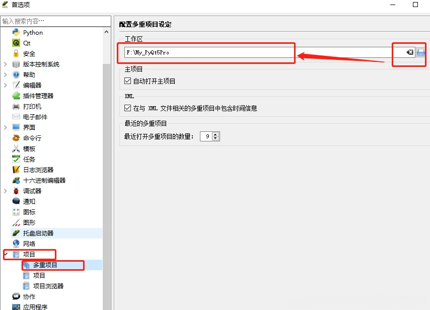 6、点击“项目”->“多重项目”,在工作去选择一个文件夹,如下图所示: