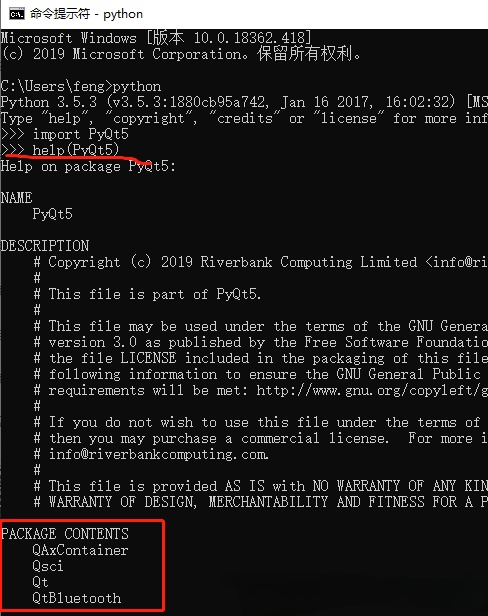 3、可以通过 help(PyQt5)命令查看PyQt5所依赖的模块: