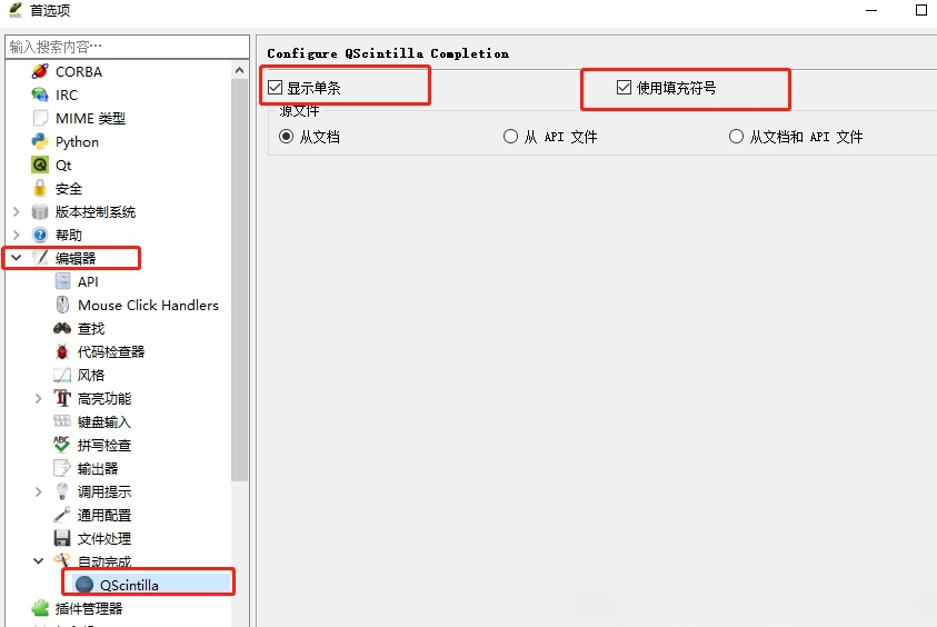 2、点击“编辑器”->“自动完成”->“QScintilla”,配置如下图所示: