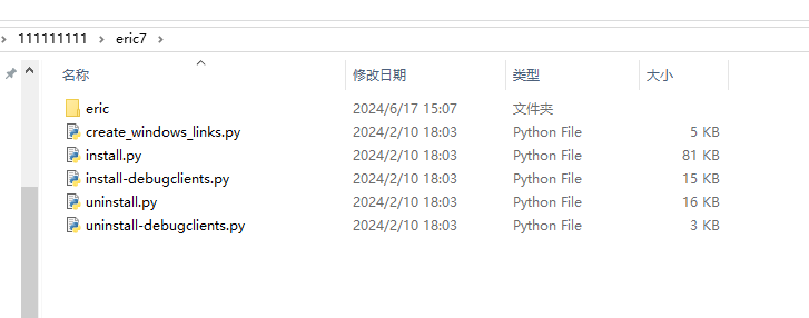 在一切准备就绪之后,我们开始安装Eric7,一、进入到我们刚刚命名的eric7文件夹中,可以双击install.py文件安装,二、或是使用命令安装,在命令行输入如下命令即可命令安装: