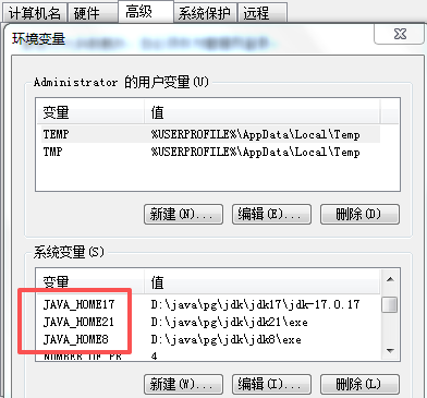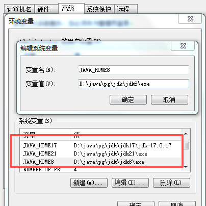 变量名写JAVA_HOME8 变量值写安装文件夹目录地址,相同操作新建出一下红框中的jdk17和21的系统变量(免安装版本17直接是解压后的文件目录即可),自己下的JDK几就对应写几