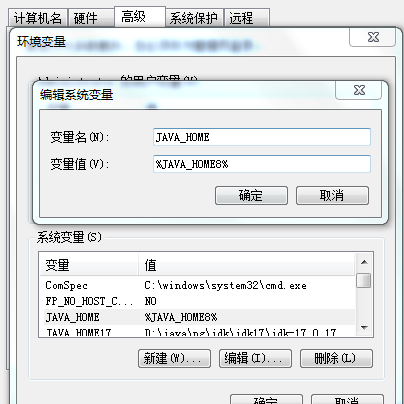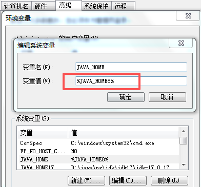 最后新建变量JAVA_HOME 变量名:JAVA_HOME 变量值:%JAVA_HOME8%(自定义默认8)