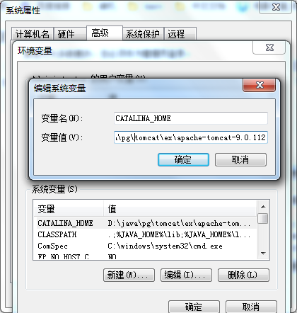 继续再新建系统变量,变量名为:CATALINA_HOME,变量值为:D:\java\pg\tomcat\ex\apache-tomcat-9.0.112(这里的变量值与上面的一样)