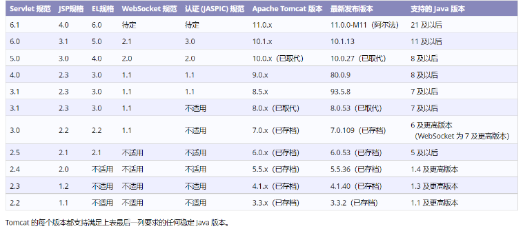 即tomcat版本不能低于能兼容的jdk版本,目前主流开发JDK版本基本在1.8以上,所以Apache Tomcat 9.x是当前的开发重点。它建立在Tomcat 8.0.x和8.5.x之上,并实现了Servlet 4.0,JSP 2.3,EL 3.0,WebSocket 1.1 和JASPIC 1.1规范(Java EE 8平台要求的版本)