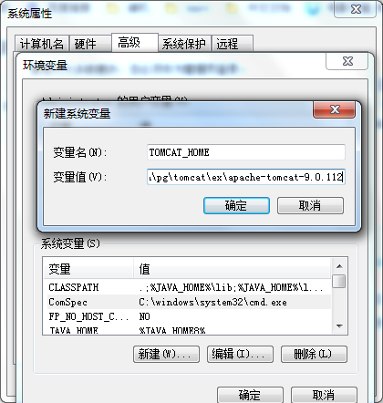 系统变量下点击新建-变量名为:TOMCAT_HOME,变量值为:D:\java\pg\tomcat\ex\apache-tomcat-9.0.112(自己新建的Tomcat解压缩后的目录)