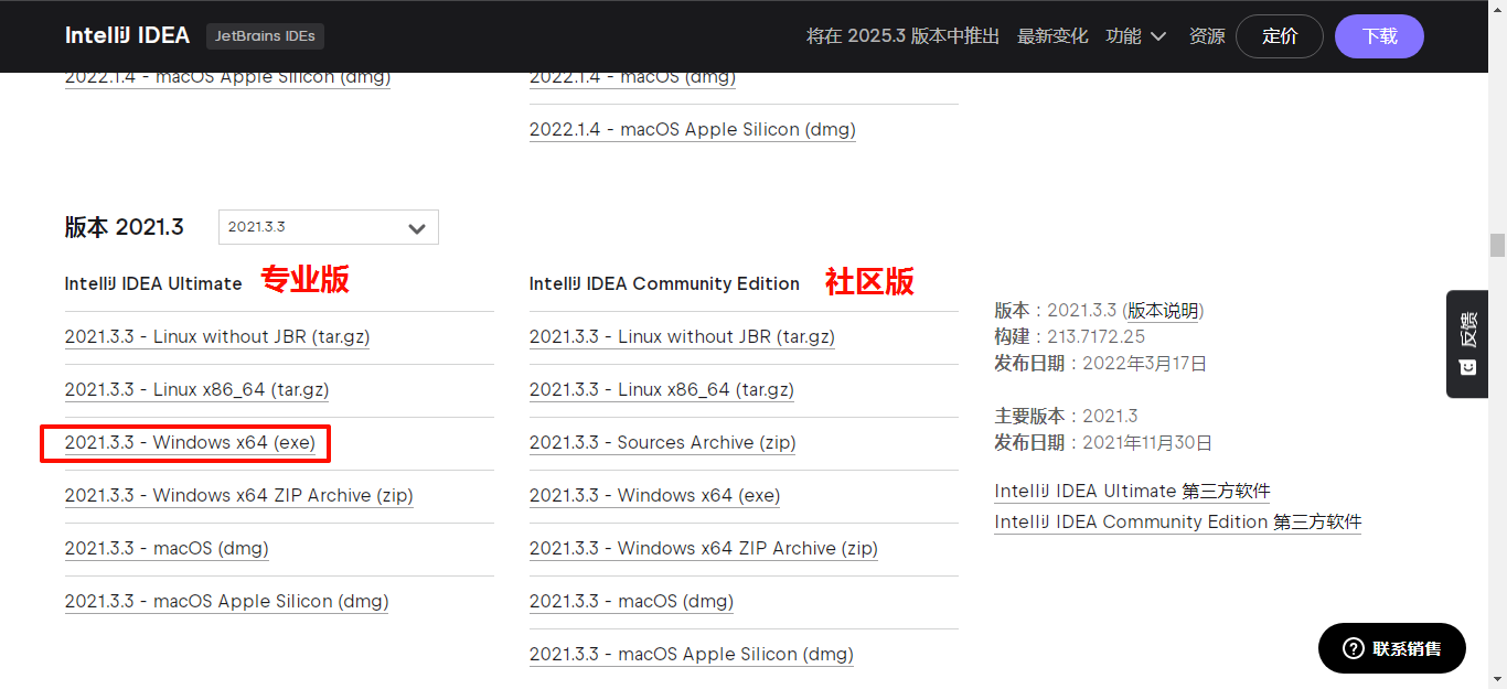 选择适合自己的版本下载,此处我选择对win7兼容较友好且兼容较高版本JDK的 2021.3专业版本