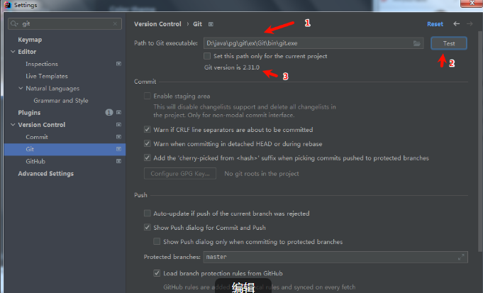 1选择本地git.exe地址,2点击Test,出现3中字样即可
