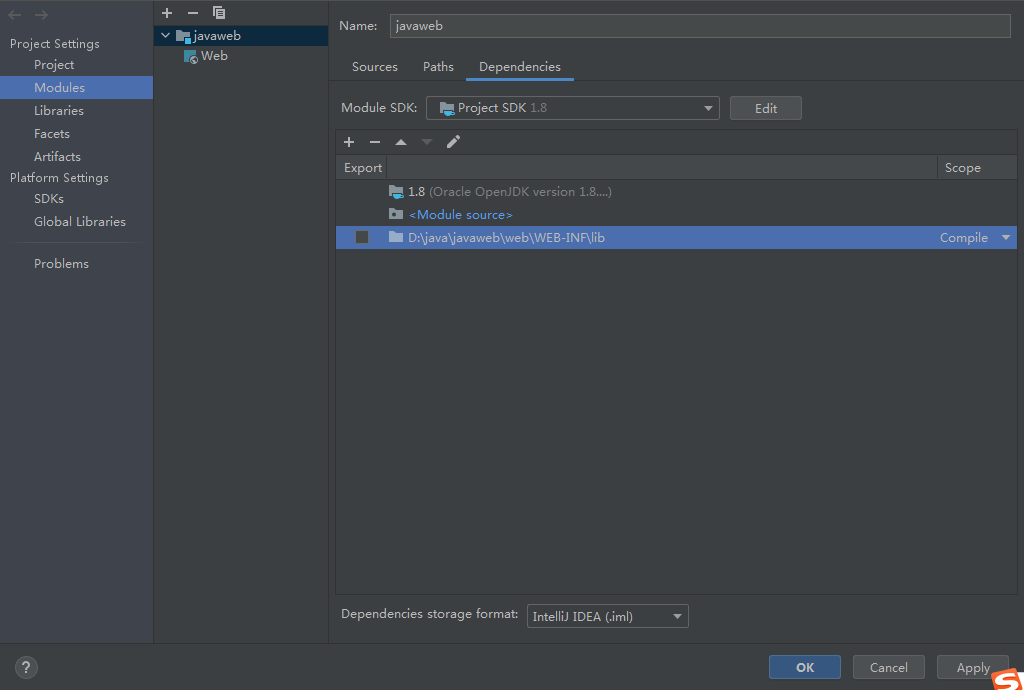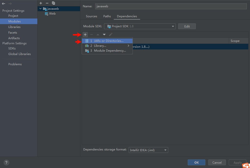 以上同样页面构建操作选Dependencies:点击加号添加JAR or Directories..——选择你创建的lib文件夹——选择作为jar directory 点击应用保存即可