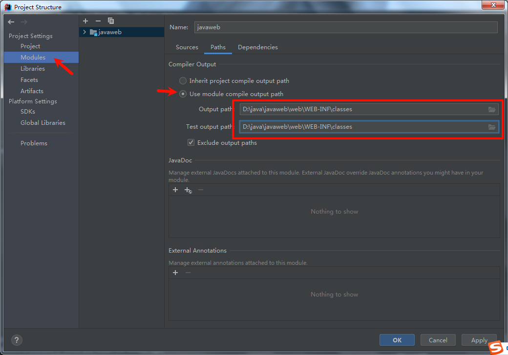 File-> Project Structure-> Modules-> Paths-> 勾选第二个Use module..,修改两个路径均为classes路径,应用保存。