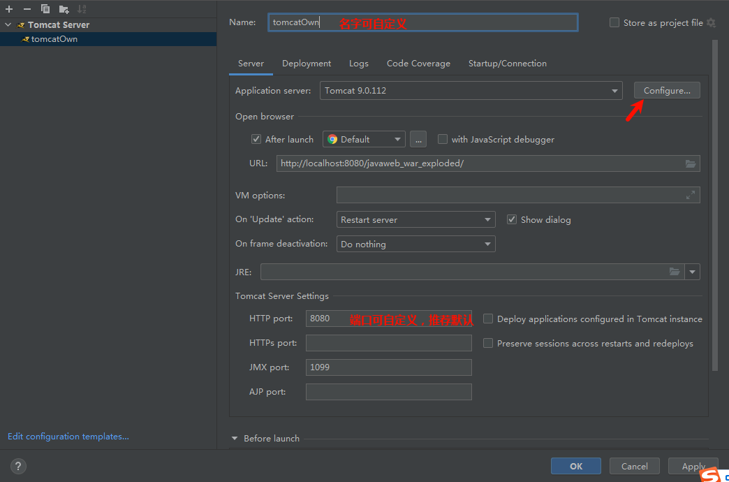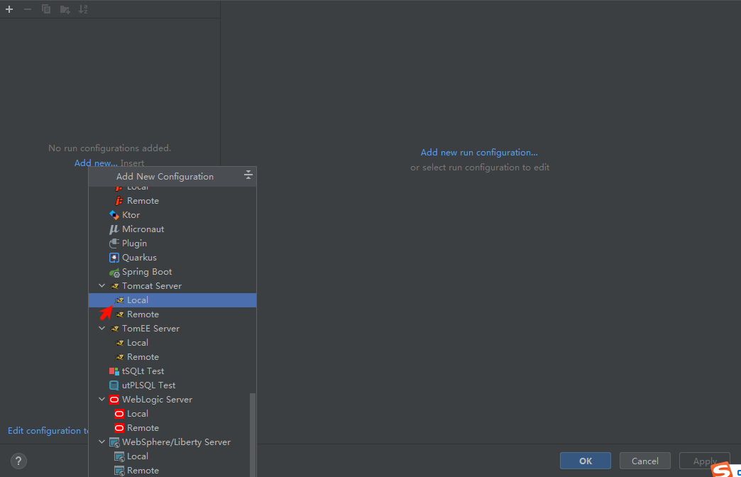 Run-> Edit Configurations -> “+” 选tomcat Server的local