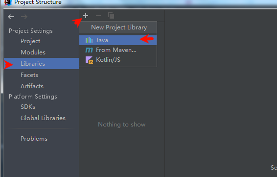 同上打开构建菜单FileProject Structure-> libraries -> “+”,选择java