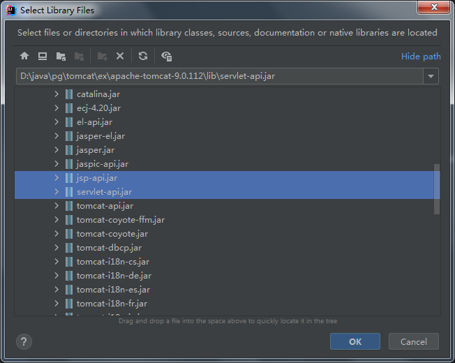 找到tomcat路径下的lib文件夹,选中以下两个jar包,点ok添加进来。