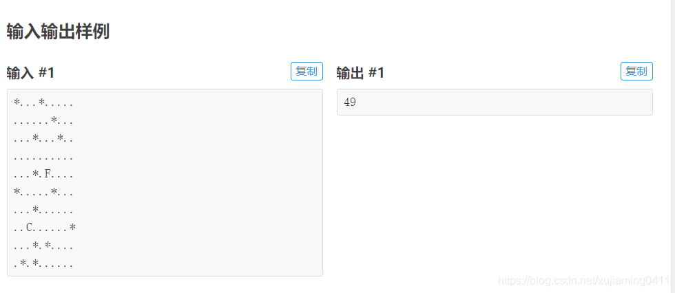 追击在10×10 的平面网格内进行。一个格子可以是:一个障碍物,两头牛(它们总在一起),或者 Farmer John。两头牛和 Farmer John 可以在同一个格子内(当他们相遇时),但是他们都不能进入有障碍的格子。