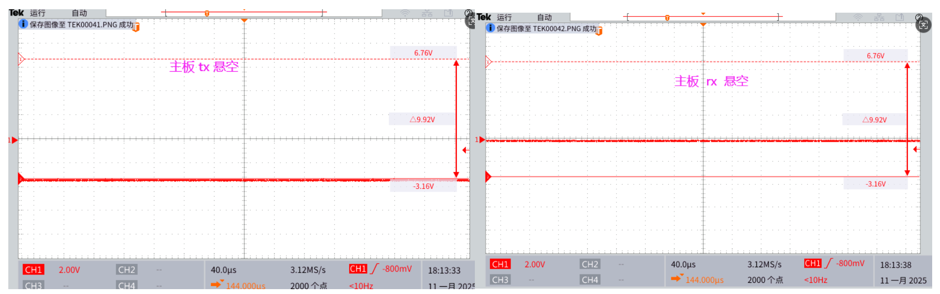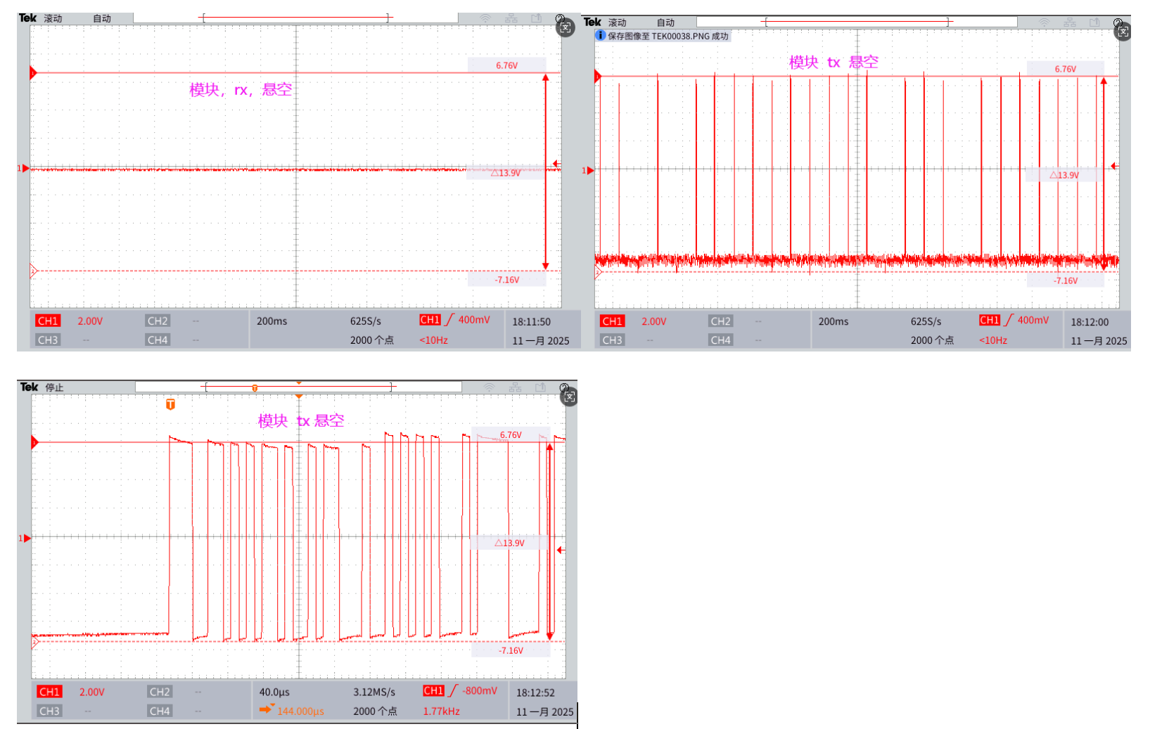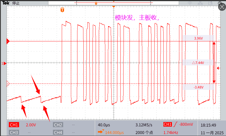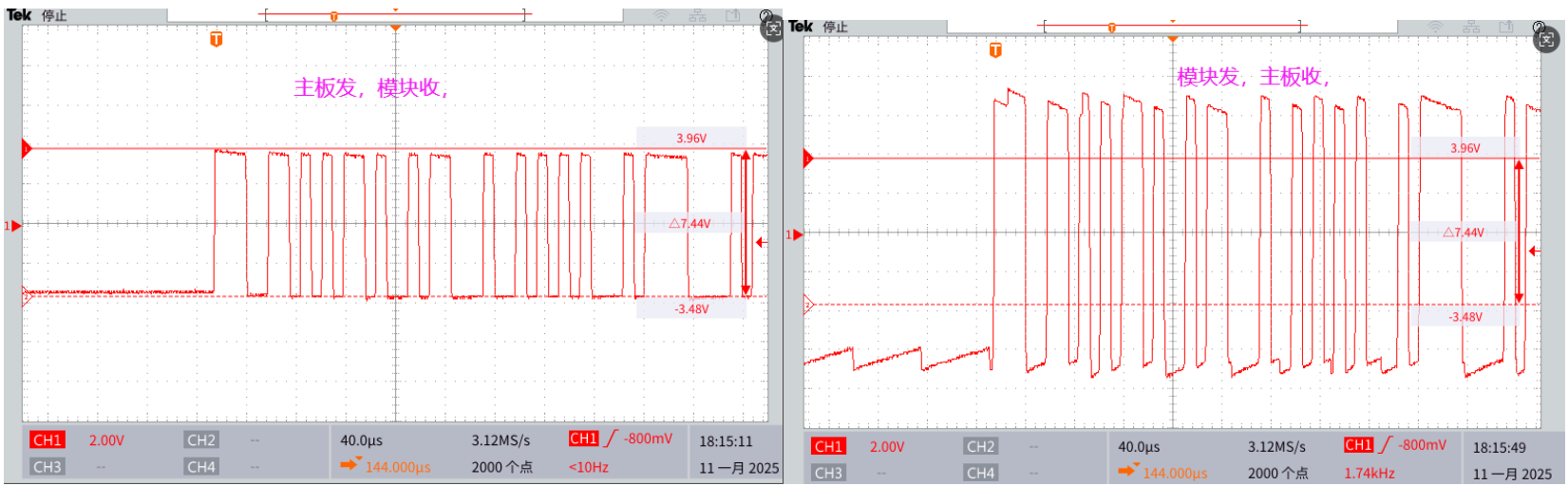 可以看到主板作为3.5v左右的电平能够发送到模块,模块能够正常接收,说明后续的我们模块作为发送端,不管怎么样,都能够吧命令发送出去,