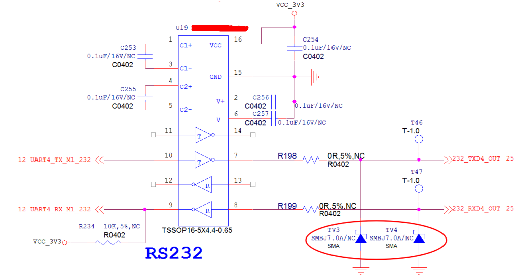 近小伙伴发现产品上的RS232有点问题,RS232的负半部分波形被削掉了,导致通信异常,需要把esd拆掉才能恢复,