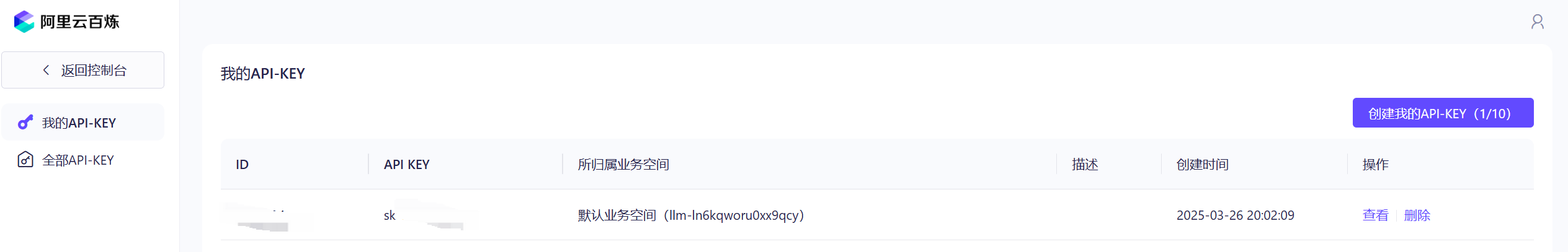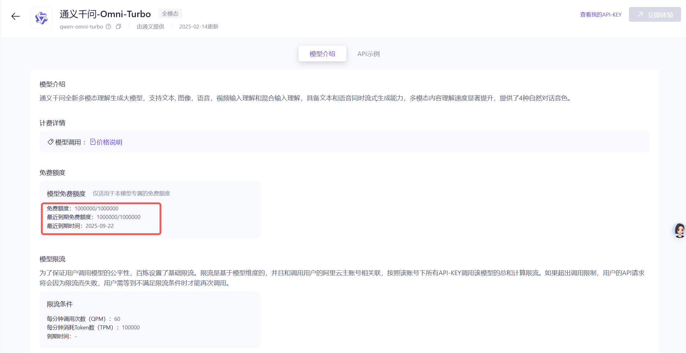 先去阿里百炼平台注册API-KEY,目前大部分模型有免费额度,自注册开始有限期180天。