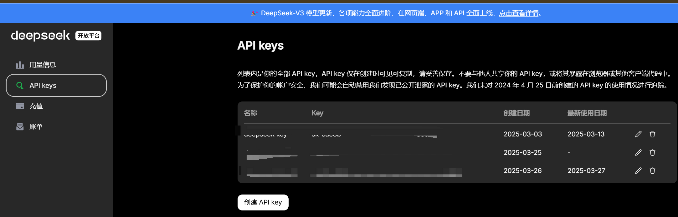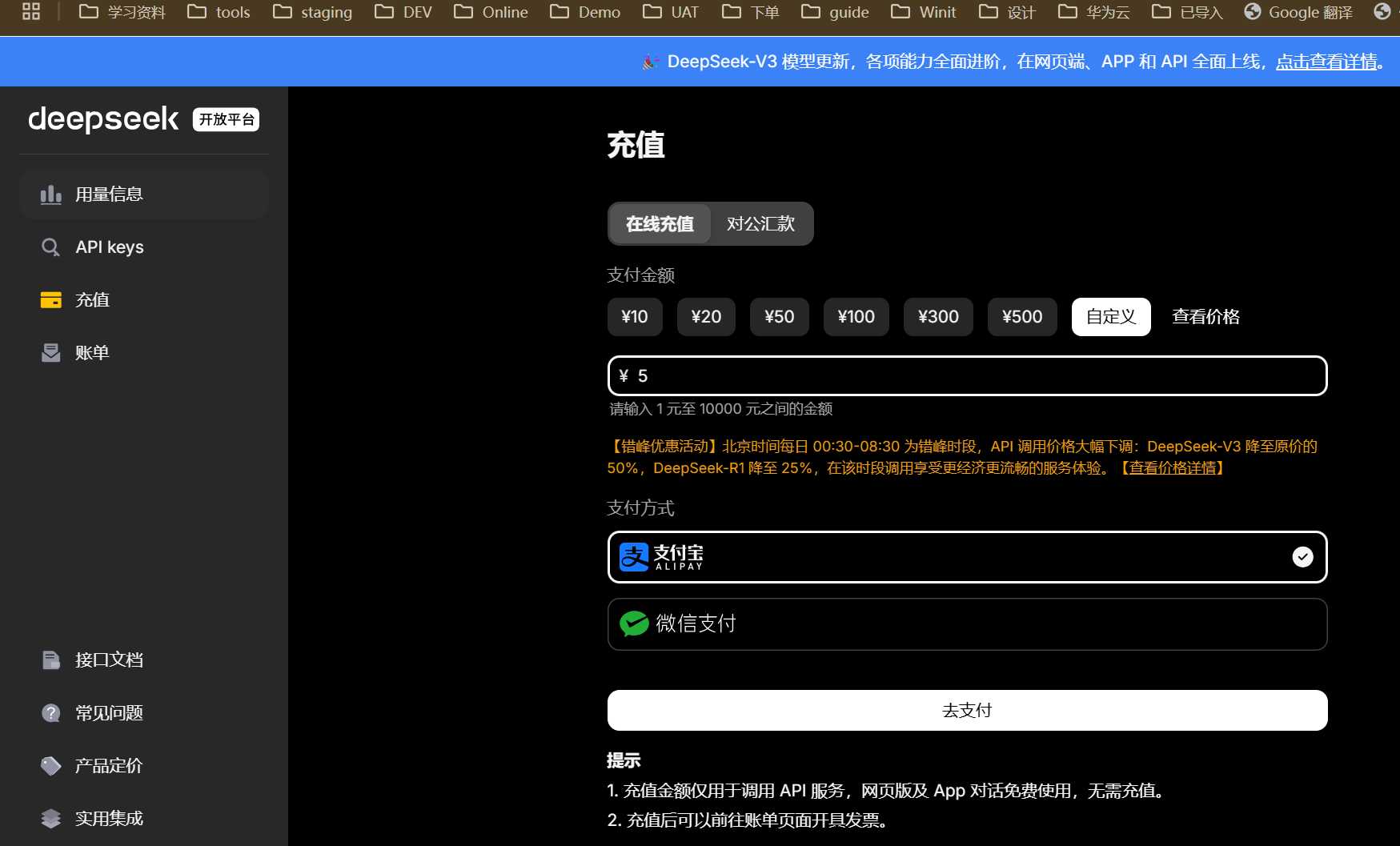 DeepSeek官网创建API key,调用API需要充值,不然会报错:余额不足,充几块可以用很久