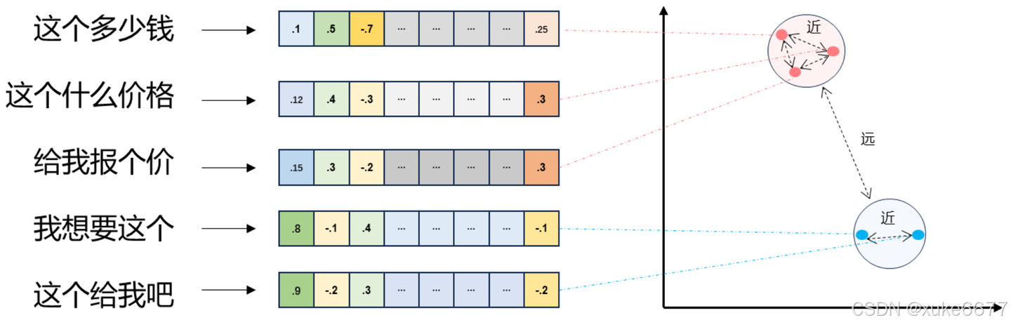 - 向量之间可以计算距离,距离远近对应 语义相似度 大小。