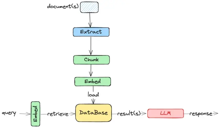 于文档的检索增强生成有两个阶段。在第一阶段,文档会被处理并安装到数据库中,通常是向量数据库。第二阶段则是如下所示的数据检索: