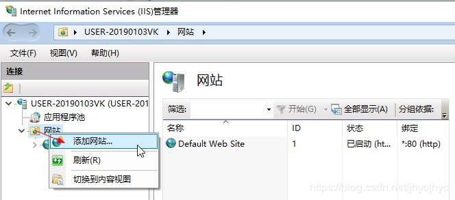 在控制面板中找到管理工具,进行管理工具,双击其中的Internet Information Services.在左侧栏中右击“网站”,选“添加网站”,如下图所示。