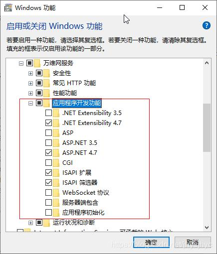 如上图,展开“万维网服务”,展开“应用程序开发功能”,按图示勾选其中的四项。