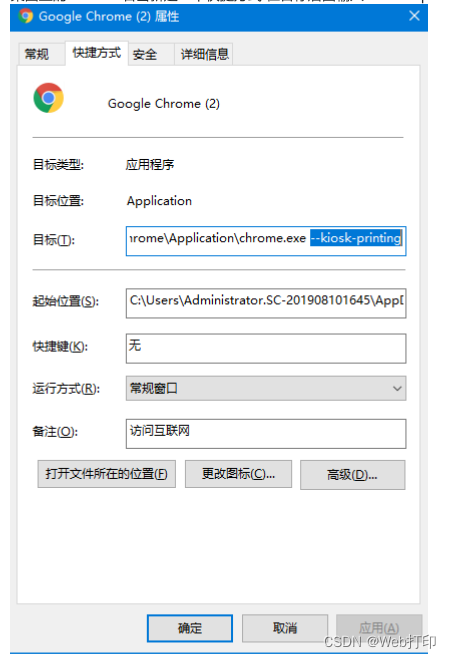 右击新建的快捷方式右击属性,在目标后面输入 --kiosk-printing (有空格)