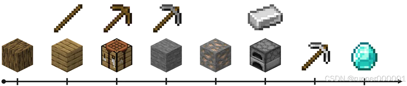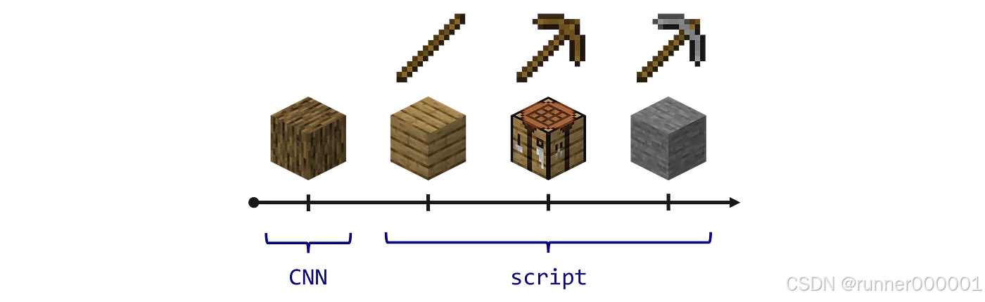 按照这个模式,我们将使用卷积神经网络(CNN)采集足量木材(3000 步)。接着通过预设脚本依次制作木板、木棍、工作台、木镐,并开始挖掘脚下的石头。这些石头可用于制作石镐,进而开采铁矿。