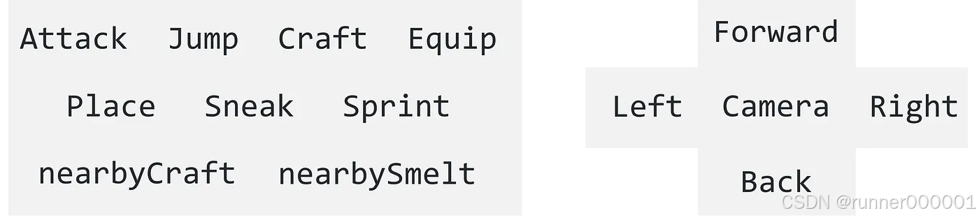 本示例中,我们手动定义了 7 个相关动作:攻击、前进、跳跃以及镜头移动(左、右、上、下)。另一种常见方法是应用 K 均值算法来自动提取人类执行的最相关动作。无论采用哪种方式,目标都是剔除对完成任务最无用的动作——比如本例中的物品合成。