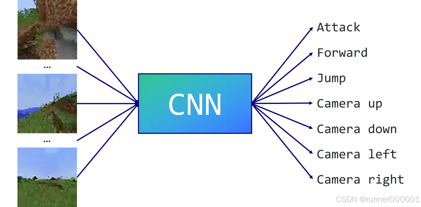 该问题可简化为多类别分类任务。我们的数据集由 mp4 视频构成,因此将使用卷积神经网络(CNN)将这些图像转换为相应动作。同时我们也要限制可执行动作(类别)的数量,这样 CNN 的选择会更少,意味着训练效率会更高。