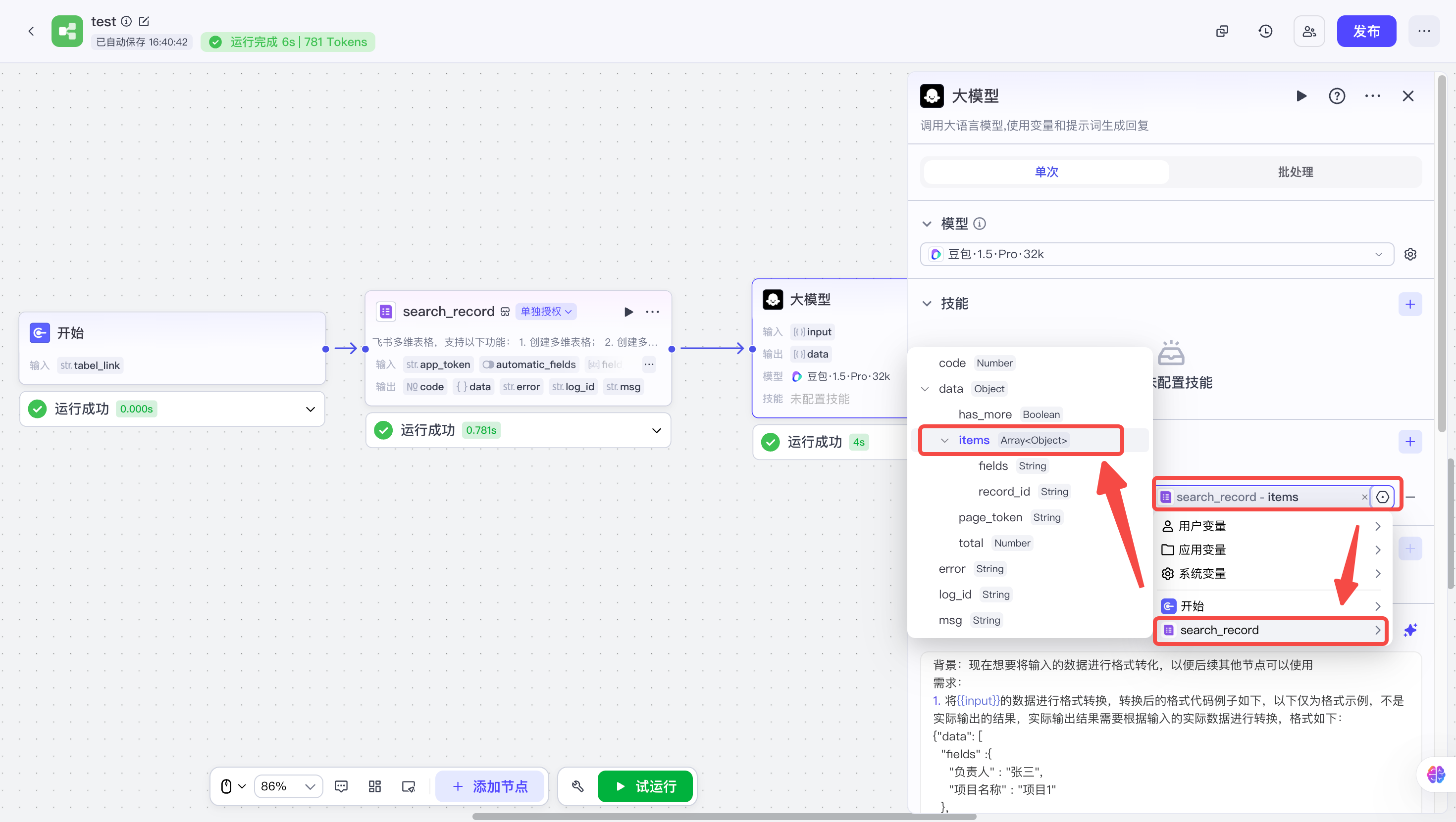 三、方法二:使用【大模型节点】转换多维表格数据格式