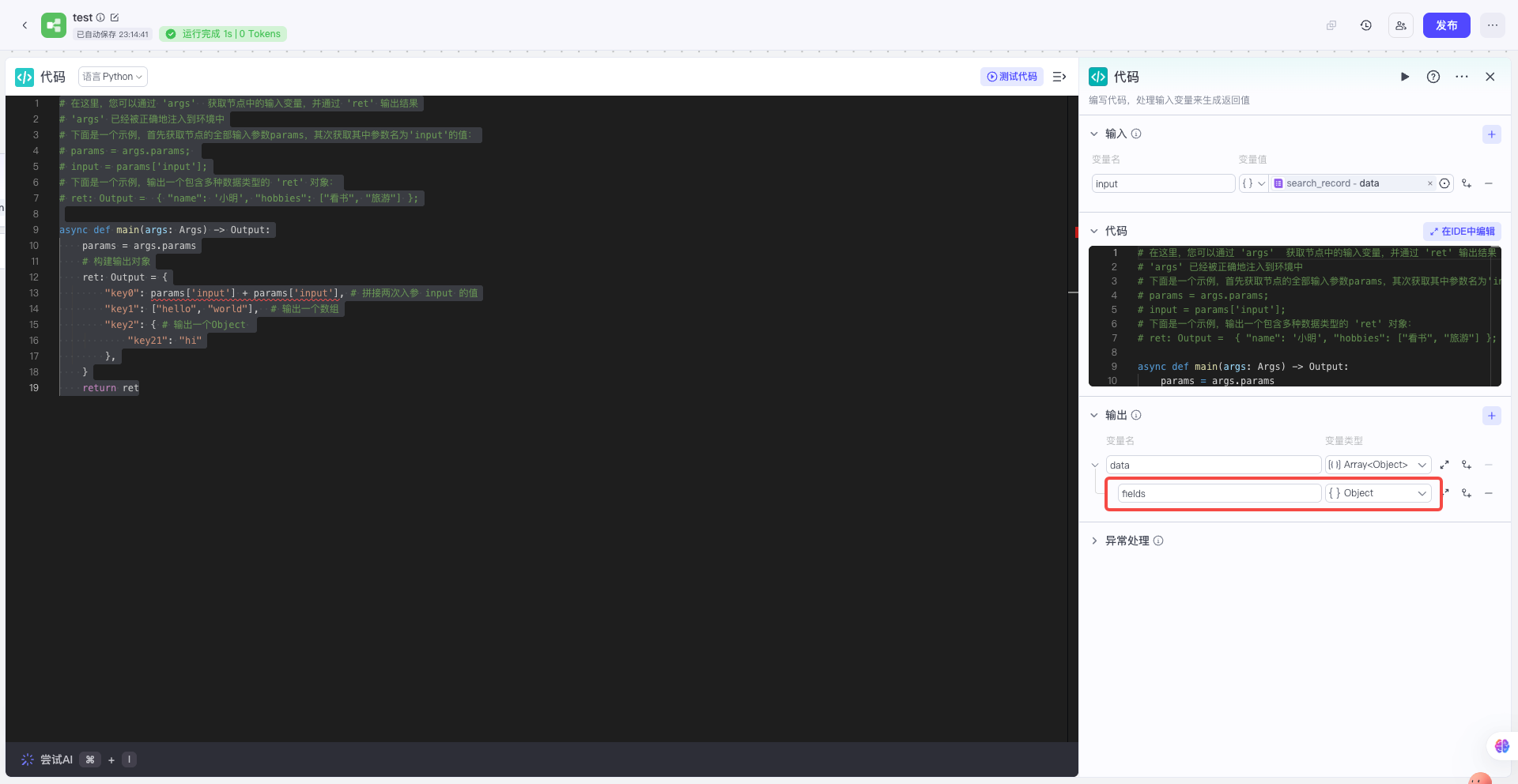 | 对照上面预期的输出结构,在代码节点配置变量名称和变量类型