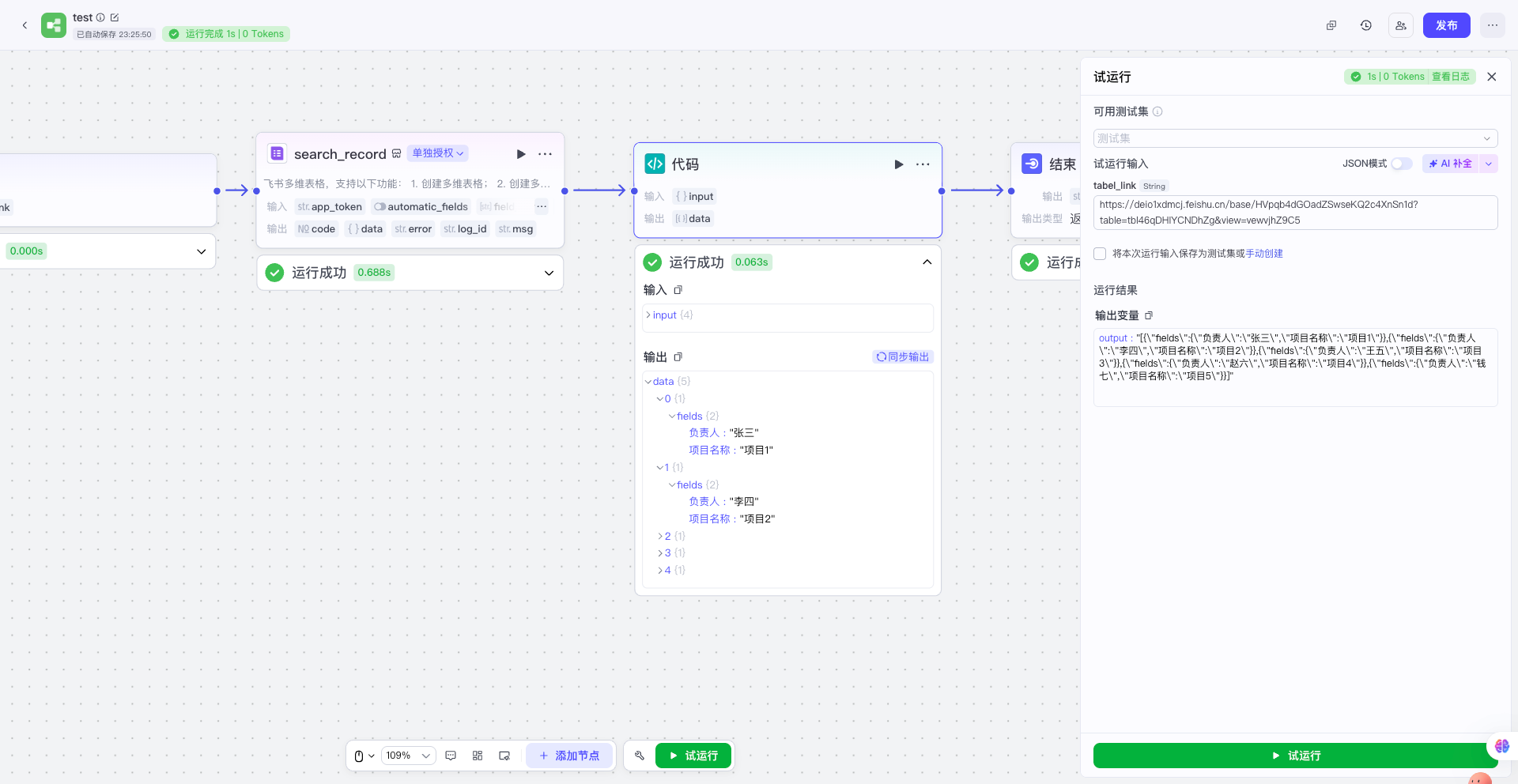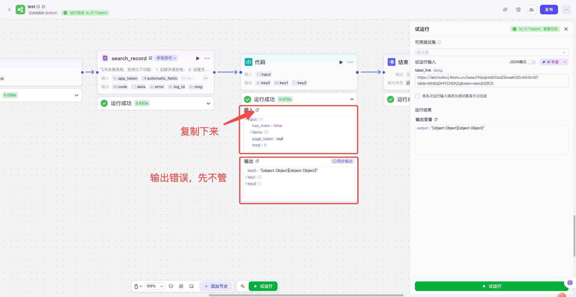 | 把其他节点先随便连接上,先使用少量数据,让整个工作流可以运行起来;然后获取多维表格传给代码节点的真实数据,并且复制下来备用 | ![]() |