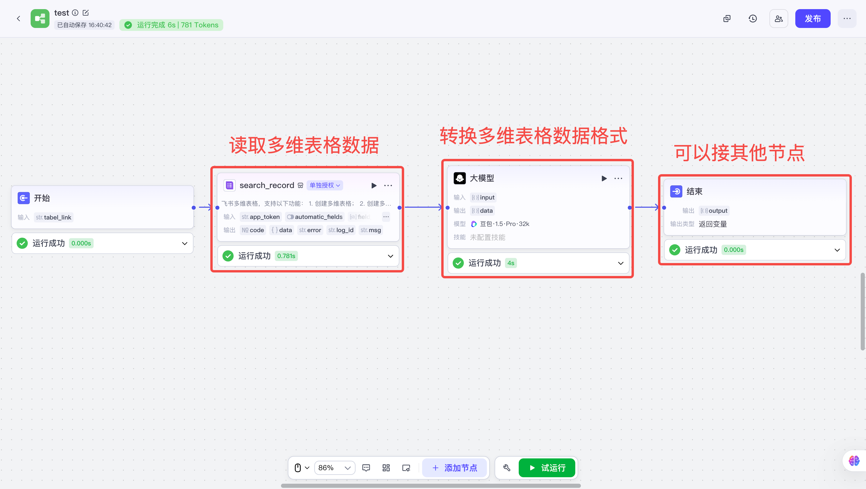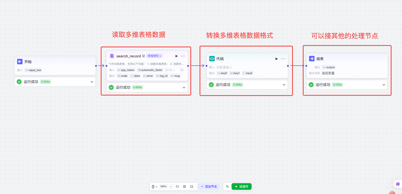 | 把其他节点先随便连接上,让整个工作流可以运行起来;然后获取多维表格传给代码节点的真实数据,并且复制下来备用 | ![]() |