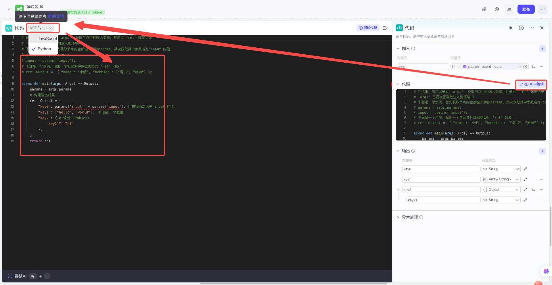 | 点开代码节点,点击【在IDE中编辑】,再选择【python】语言,然后把代码框中的所有内容,原封不动的复制下来备用 | ![]() |