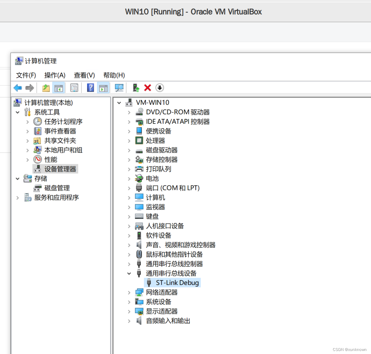 添加完之后,可以在虚拟机的设备管理里面看到ST-LINK debug: