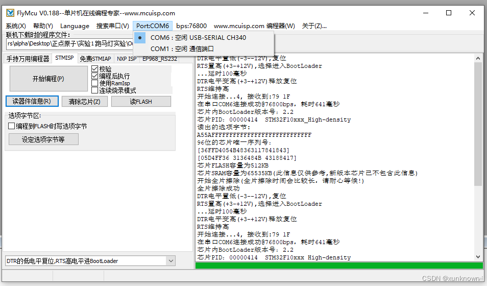 通过USB接口(应该是任意一个USB接口都可以)连接开发板,打开串口下载工具FlyMCU,选择对应的USB串口(我这里是CH340),就可以下载程序到开发板了,例如: