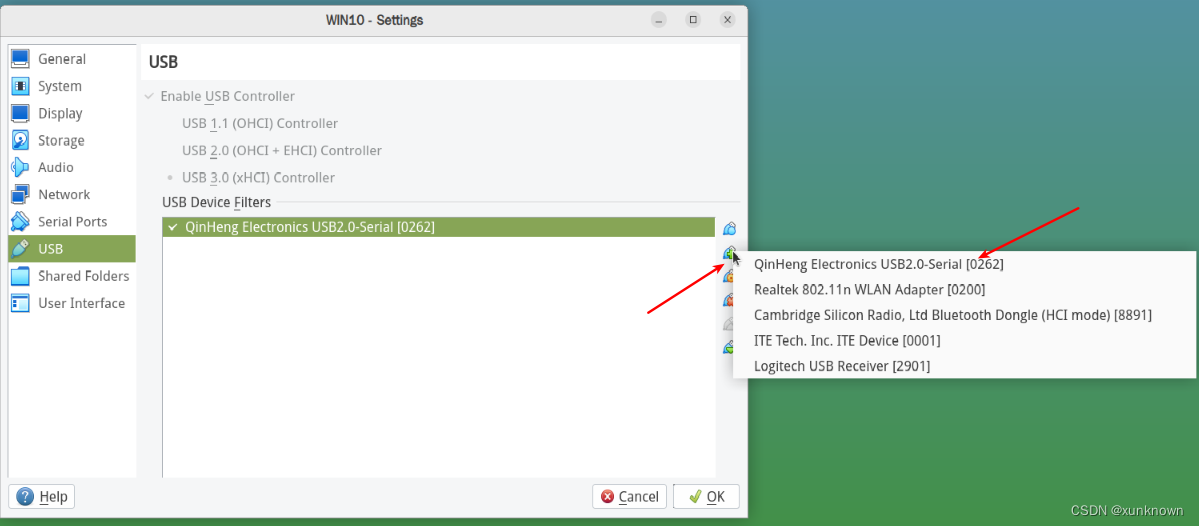 虚拟机添加USB接口过程:打开虚拟机的设置界面,进入USB设置页面Setting/USB,选择添加USB设备过滤器(USB Device Filters),添加USB串口,如下图所示。