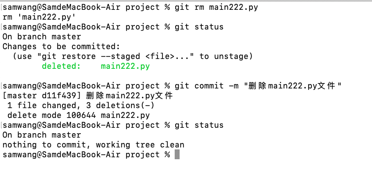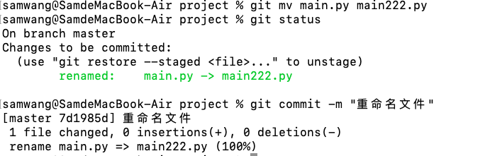 有时候我们想修改一下文件名,如果文件没提交还好,如果提交了,此时直接修改名字,比如main.py已经提交,此时我将其重命名为run.py,此时对于git而言,你做了两件事,一是删除了main.py,二是新增了run.py,相比较会麻烦一点。所以git提供了重命名的命令git mv 旧文件名 新文件名。